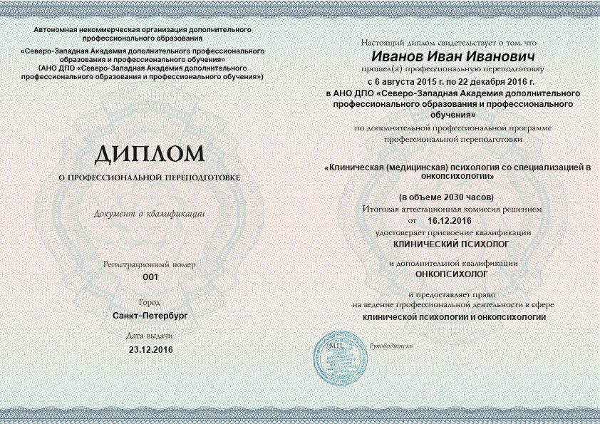 Каждый документ (диплом/удостоверение/свидетельство) соответствует п.2 ст.60 N-273 ФЗ, оформляется на русском языке, печатается на типографском бланке, защищённом от подделок. Ставится официальная печать образовательной организации. С образцами документов можно ознакомиться на сайте в разделе «Лицензия и документы».