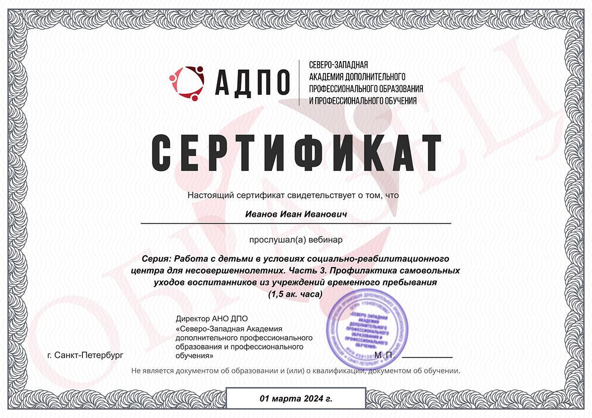 Каждый документ (диплом/удостоверение/свидетельство) соответствует п.2 ст.60 N-273 ФЗ. Диплом/удостоверение/свидетельство оформляется на русском языке, печатается на типографском бланке, защищённом от подделок. Ставится официальная печать образовательной организации. С образцами документов можно ознакомиться на сайте в разделе «Лицензия и документы».